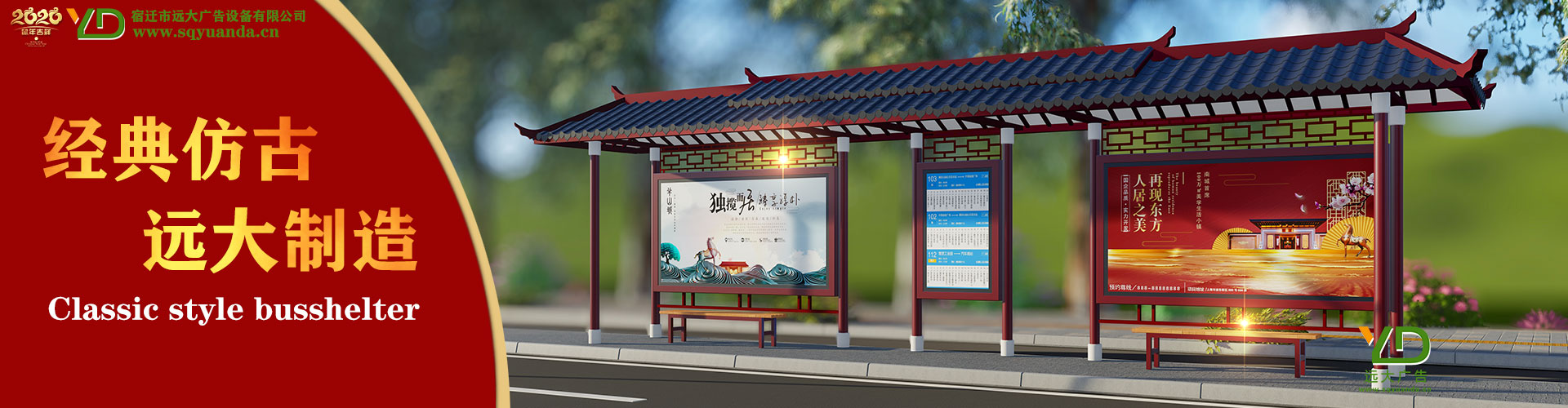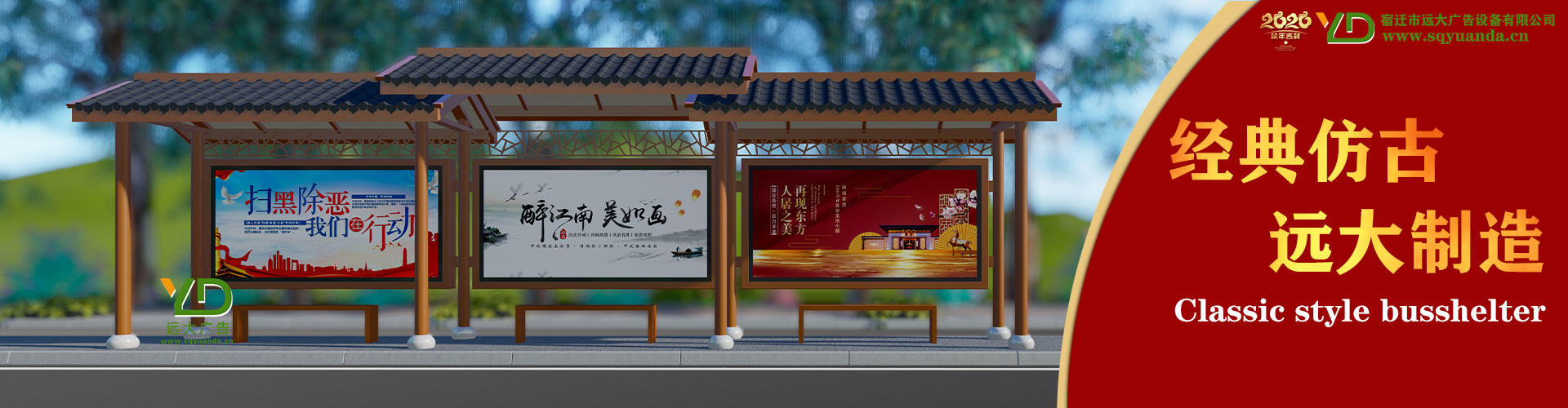 宿遷市遠(yuǎn)大廣告設(shè)備有限公司是一家專(zhuān)業(yè)生產(chǎn)公交候車(chē)亭,公交站臺(tái),閱報(bào)欄,指路牌,廣告垃圾箱,滾動(dòng)換 畫(huà)燈箱等系列產(chǎn)品廠家!產(chǎn)品多達(dá)上百種,亦可根據(jù)客戶(hù)的需求加工制作。